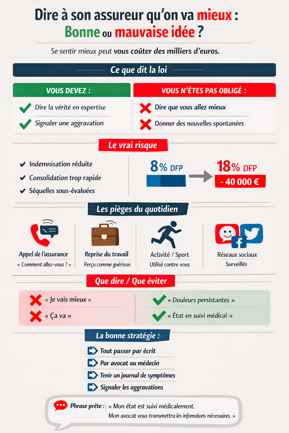 4. Consulter votre avocat avant toute initiative Avant de reprendre le travail, de déclarer une amélioration, de répondre à un questionnaire ou d'accepter une nouvelle expertise — parlez-en d'abord à votre avocat.