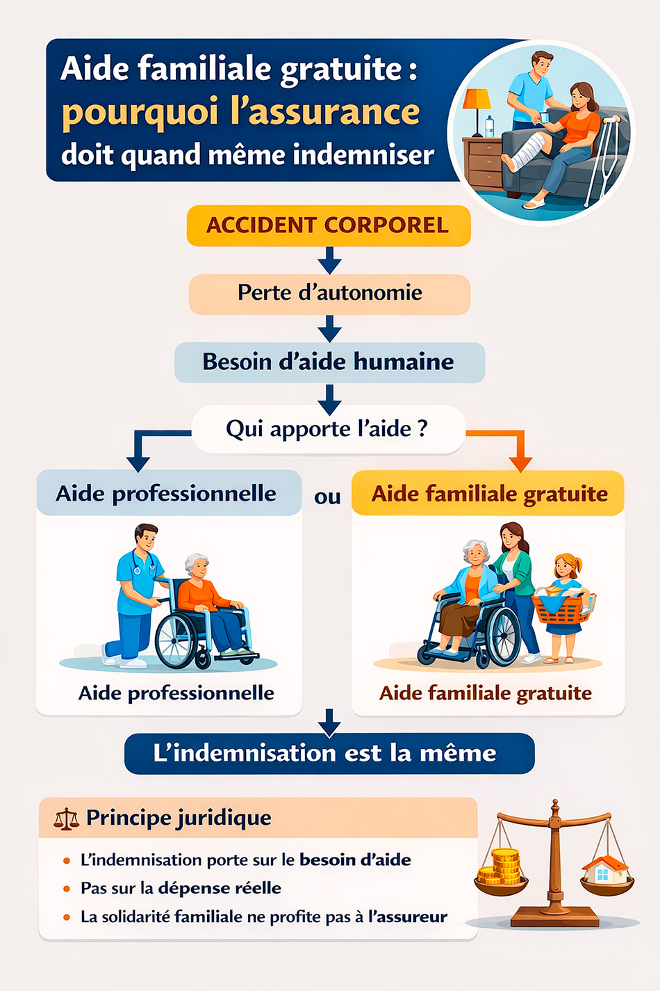 Non, et cette tentative est contraire à une jurisprudence constante de la Cour de cassation. L'indemnisation de l'assistance par tierce personne ne rembourse pas une facture — elle répare un besoin objectif d'aide humaine né de la perte d'autonomie causée par l'accident. Ce besoin existe indépendamment du fait qu'il soit couvert par un professionnel rémunéré ou par un proche bénévole. Accepter la logique de l'assureur reviendrait à faire supporter à votre famille les conséquences financières de l'accident — ce que les tribunaux refusent catégoriquement.