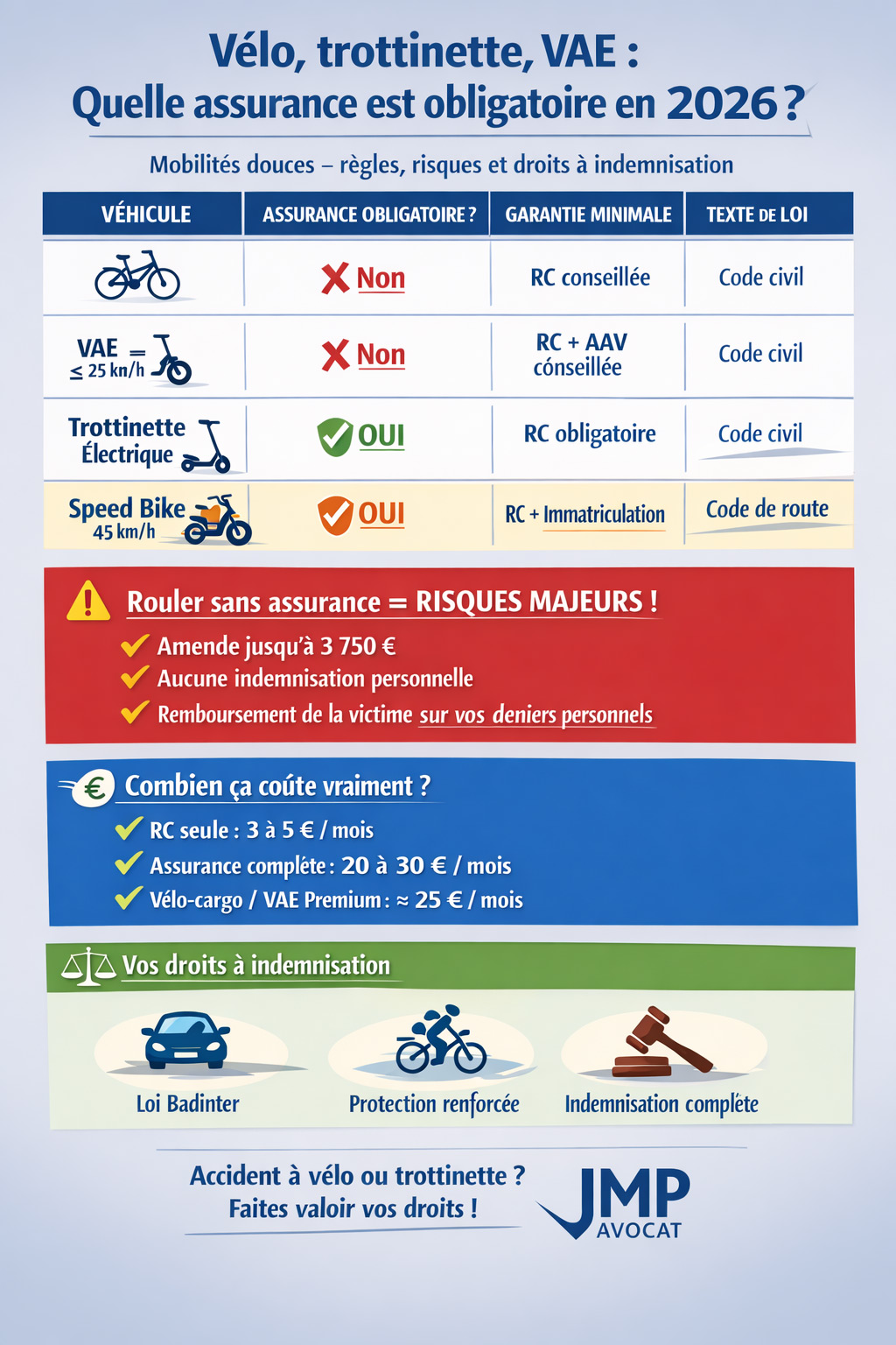 S'il est possible de rouler avec un vélo classique ou à assistance électrique dont la vitesse maximale est de 25 km/h sans assurance particulière obligatoire, il est fortement préférable de s'assurer en responsabilité civile pour couvrir les dommages causés à des tiers.