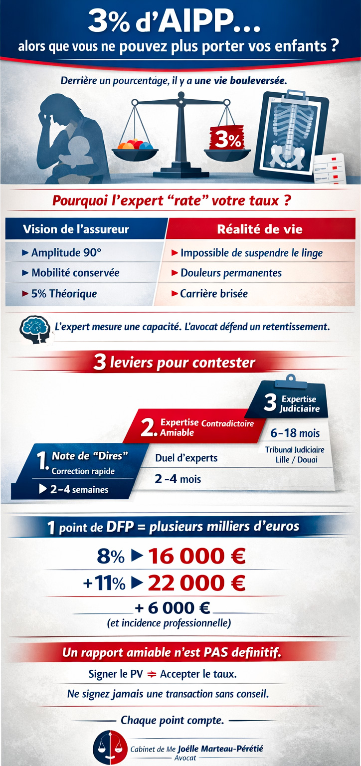 Ne laissez pas une expertise bâclée déterminer votre avenir. Votre taux d'AIPP doit refléter la réalité de vos souffrances et de vos limitations, pas une simple lecture de barèmes médicaux. Le Cabinet de Me Joëlle Marteau-Péretié, fort de son expérience en droit du dommage corporel dans les Hauts-de-France (Lille, Douai, Paris), vous accompagne à chaque étape de votre contestation.