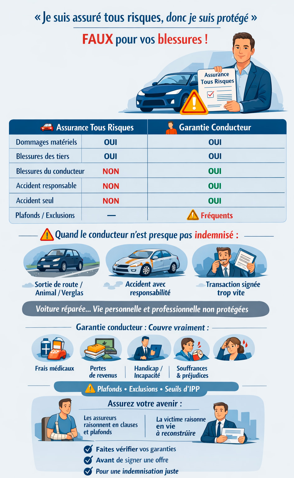 C'est précisément là que se crée la confusion dangereuse : de nombreux conducteurs pensent que la mention « tous risques » sur leur contrat leur garantit une indemnisation intégrale de leurs blessures, alors que cette protection dépend d'une garantie spécifique, souvent optionnelle.
