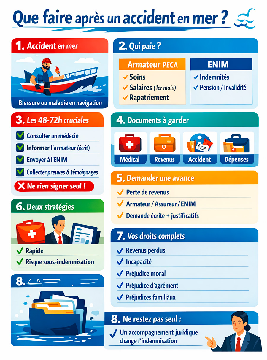 Cette page a pour objectif de vous expliquer, de manière opérationnelle, qui paie quoi, quelles démarches effectuer dans les 48-72 heures, quelles pièces rassembler pour sécuriser votre dossier et comment demander une avance (provision) pour faire face à la chute de revenus. Elle vous montre également pourquoi l'assistance d'un cabinet comme JMP Avocat Indemnisation peut changer le cours de votre indemnisation, notamment en négociation avec l'armateur, l'assureur ou l'ENIM et, si nécessaire, devant le juge.