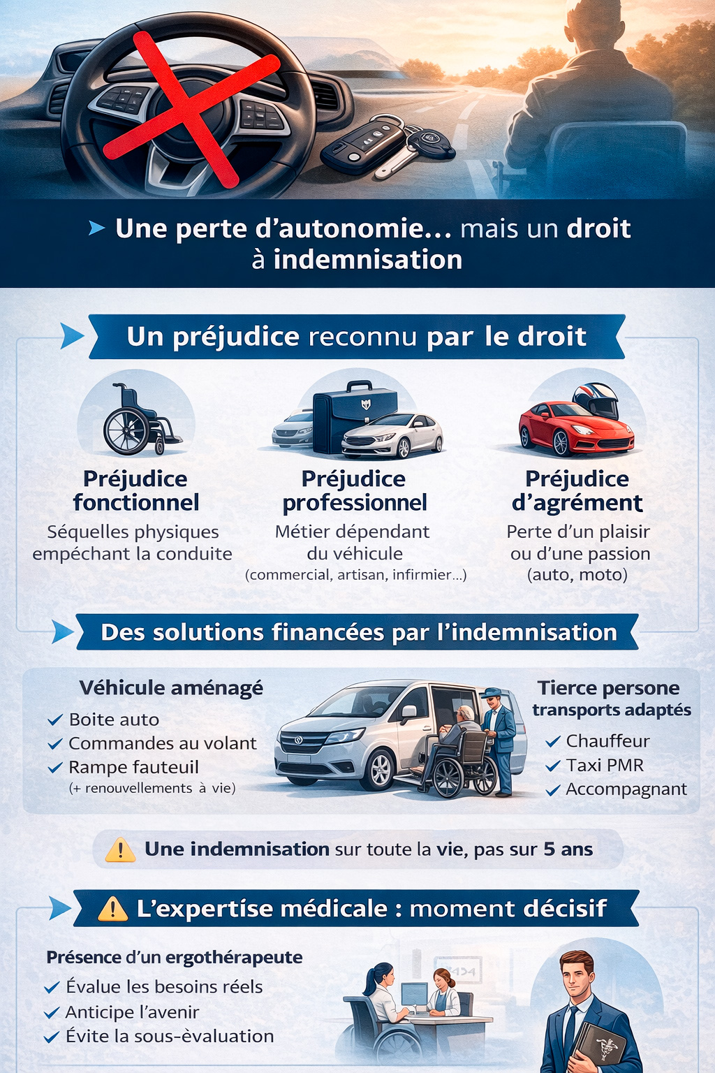 La perte de la capacité de conduire après un accident constitue un bouleversement majeur, mais elle ne doit pas signifier la fin de toute autonomie. L'indemnisation n'est pas une simple question d'argent : c'est l'outil concret qui permet de financer une nouvelle forme de liberté, différente certes, mais réelle.