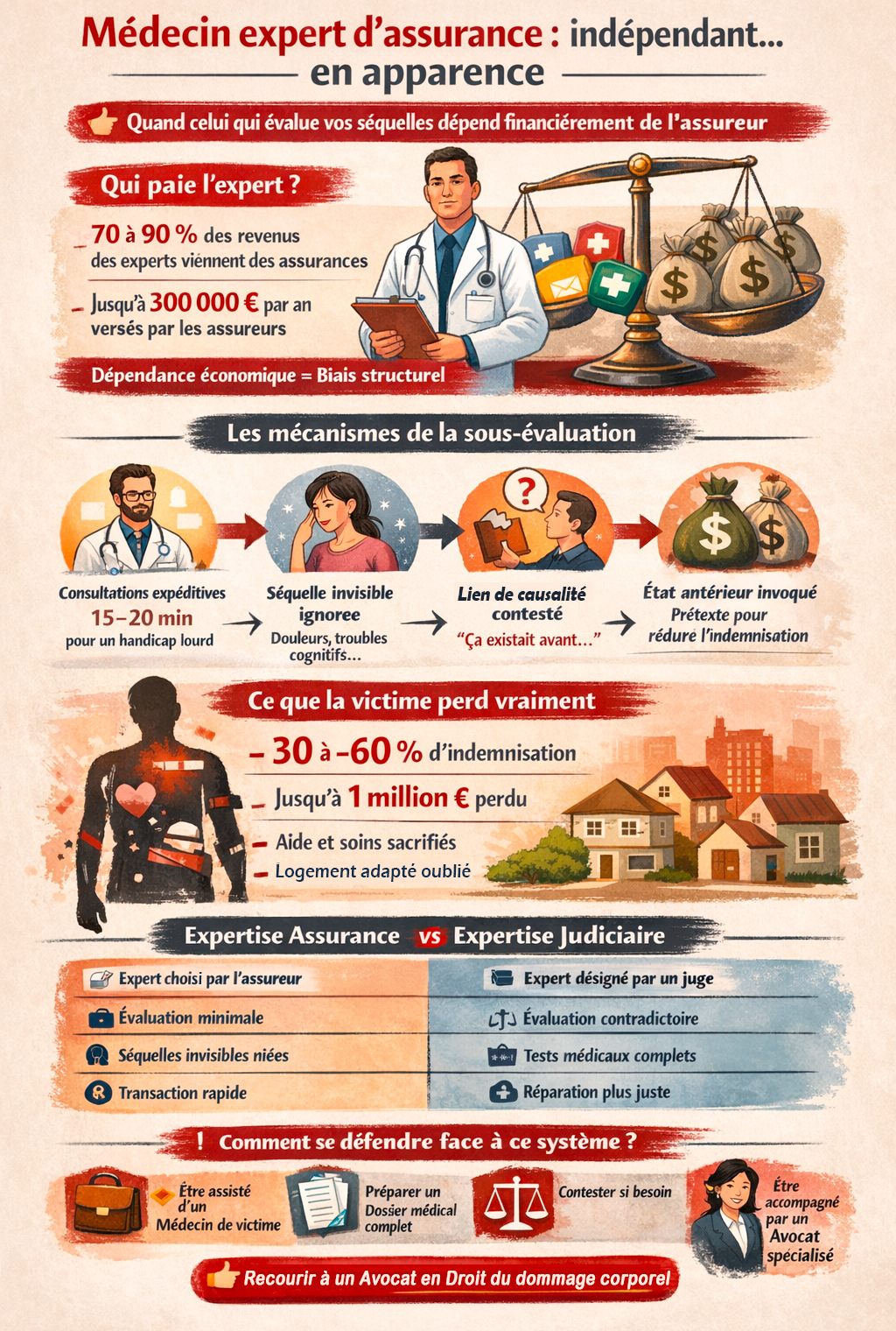 En attendant cette réforme hypothétique, les victimes doivent se protéger : ne jamais affronter seules une expertise amiable, s'entourer de professionnels indépendants (médecin de victime, avocat spécialisé), constituer des dossiers médicaux solides, et ne jamais hésiter à contester une expertise manifestement biaisée.