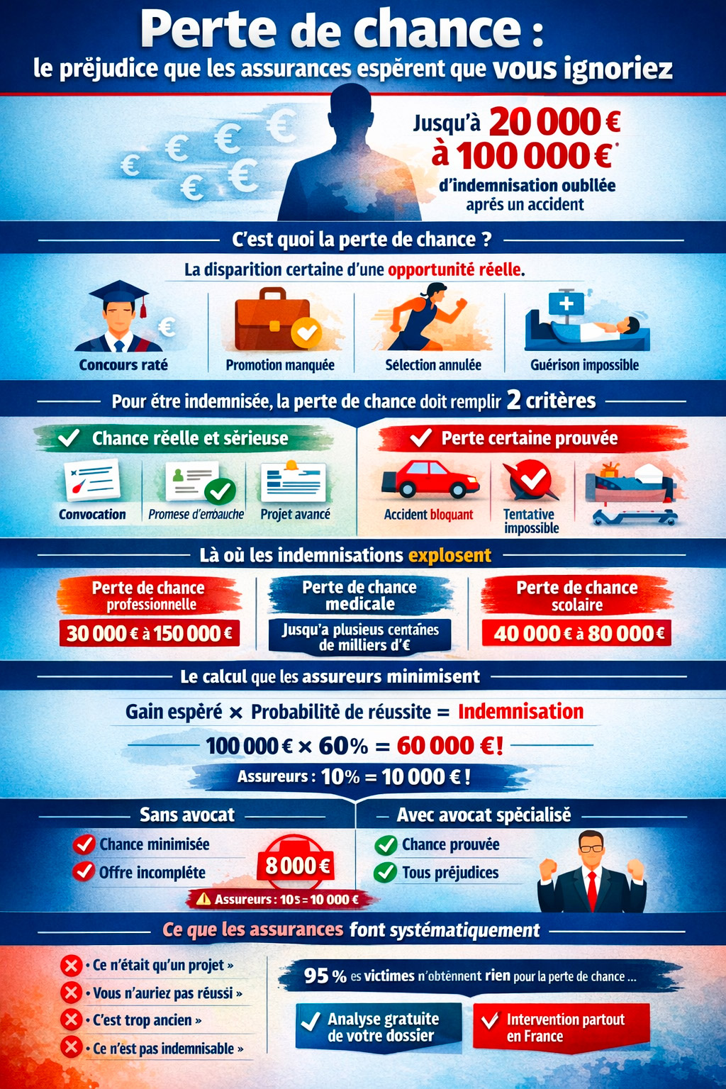 La perte de chance représente un préjudice à part entière qui ne doit JAMAIS être négligé dans votre parcours d'indemnisation. Des milliers de victimes perdent chaque année entre 20 000 et 100 000 euros en acceptant des propositions d'assurance qui ignorent totalement cette dimension.