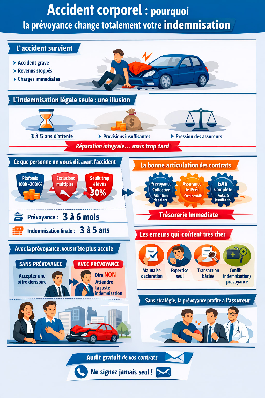 Notre cabinet JMP AVOCAT INDEMNISATION à Lille et Paris, spécialisé exclusivement dans la défense des victimes de dommage corporel, intervient dès les premiers jours suivant l'accident pour sécuriser tous vos droits. Nous analysons l'ensemble de vos contrats de prévoyance (prévoyance collective, prévoyance de prêt, GAV), nous déclarons l'accident auprès de tous les organismes concernés, nous organisons la constitution de votre dossier médical avec votre médecin-conseil de victimes, et nous élaborons la stratégie globale d'indemnisation qui articulera prestations de prévoyance, recours contre l'assureur du responsable, et prestations des caisses sociales.