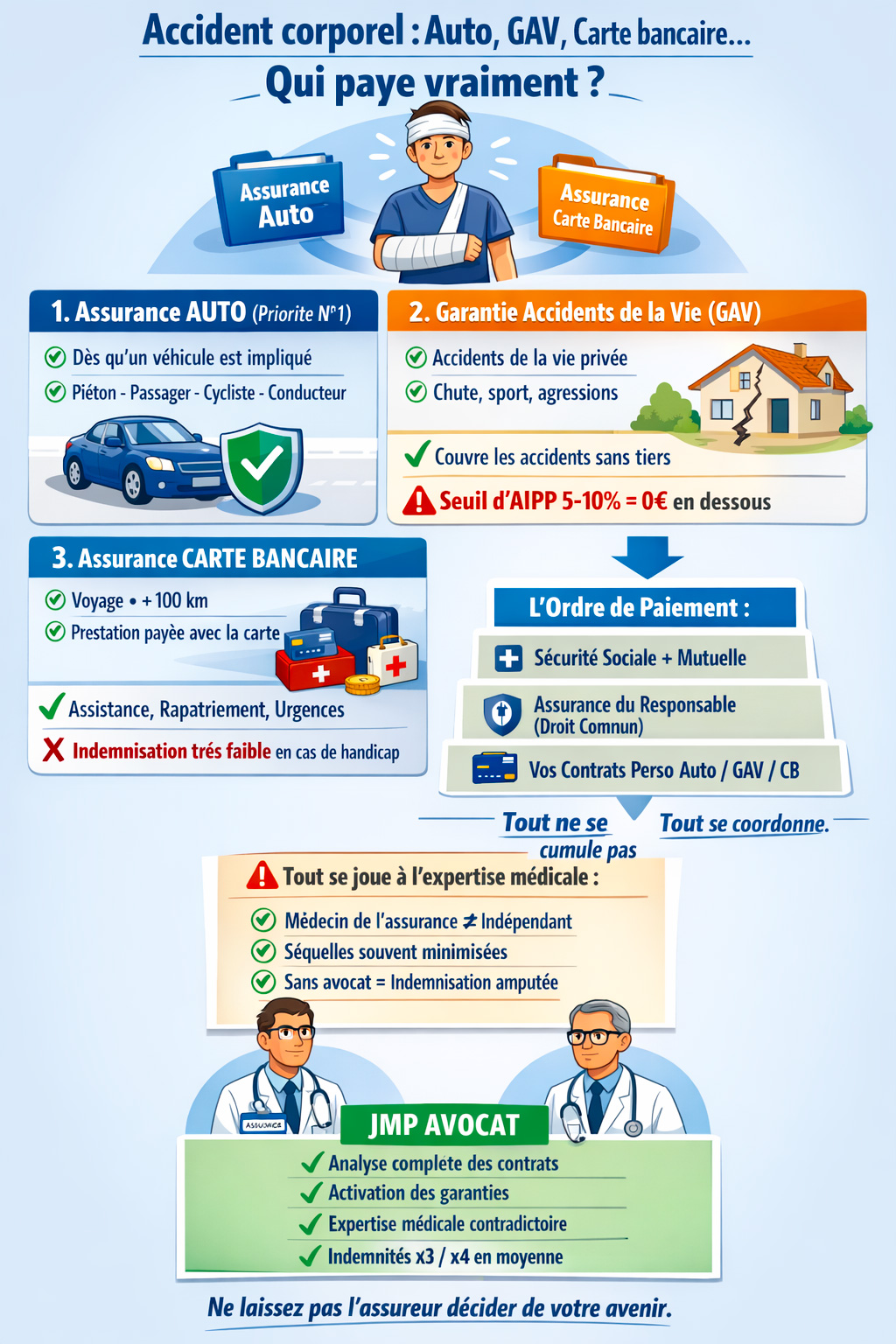 JMP AVOCAT INDEMNISATION ne travaille jamais pour les compagnies d'assurance. Notre engagement est exclusif : la défense des victimes.