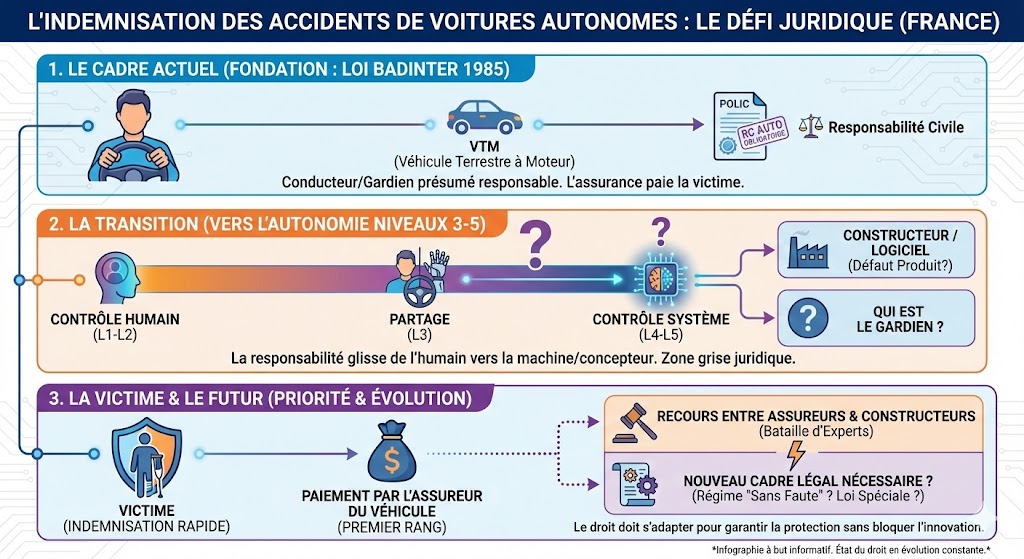 Le régime juridique français a commencé à se préciser mais reste technique : il combine la responsabilité civile générale, des règles pénales spécifiques et des obligations d’enregistrement (boîte noire / EDR).