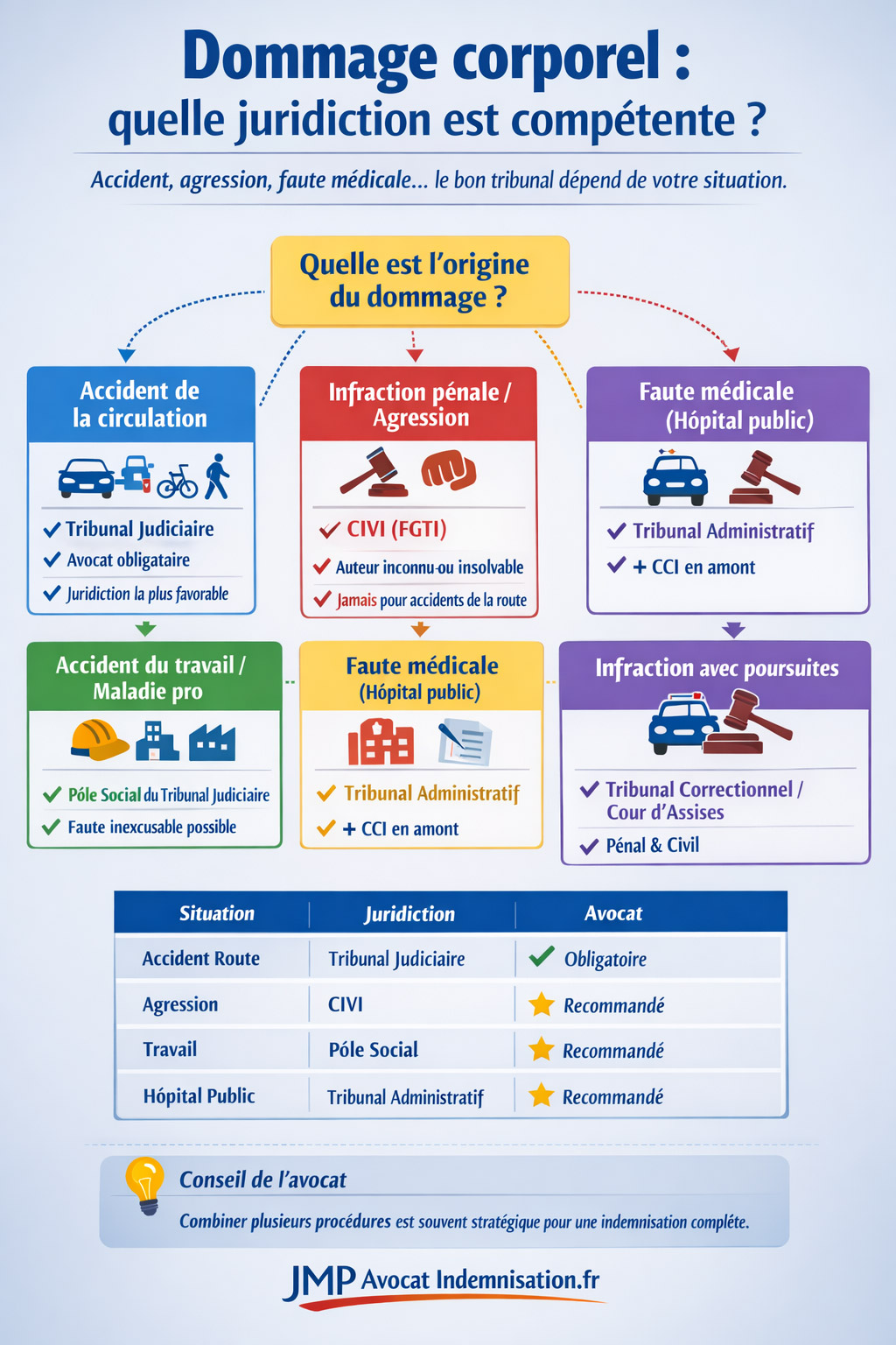 Depuis la réforme judiciaire du 1er janvier 2020, le tribunal judiciaire (anciennement tribunal de grande instance ou TGI) est la juridiction de référence en matière de réparation du dommage corporel, quelle que soit l'origine du préjudice.